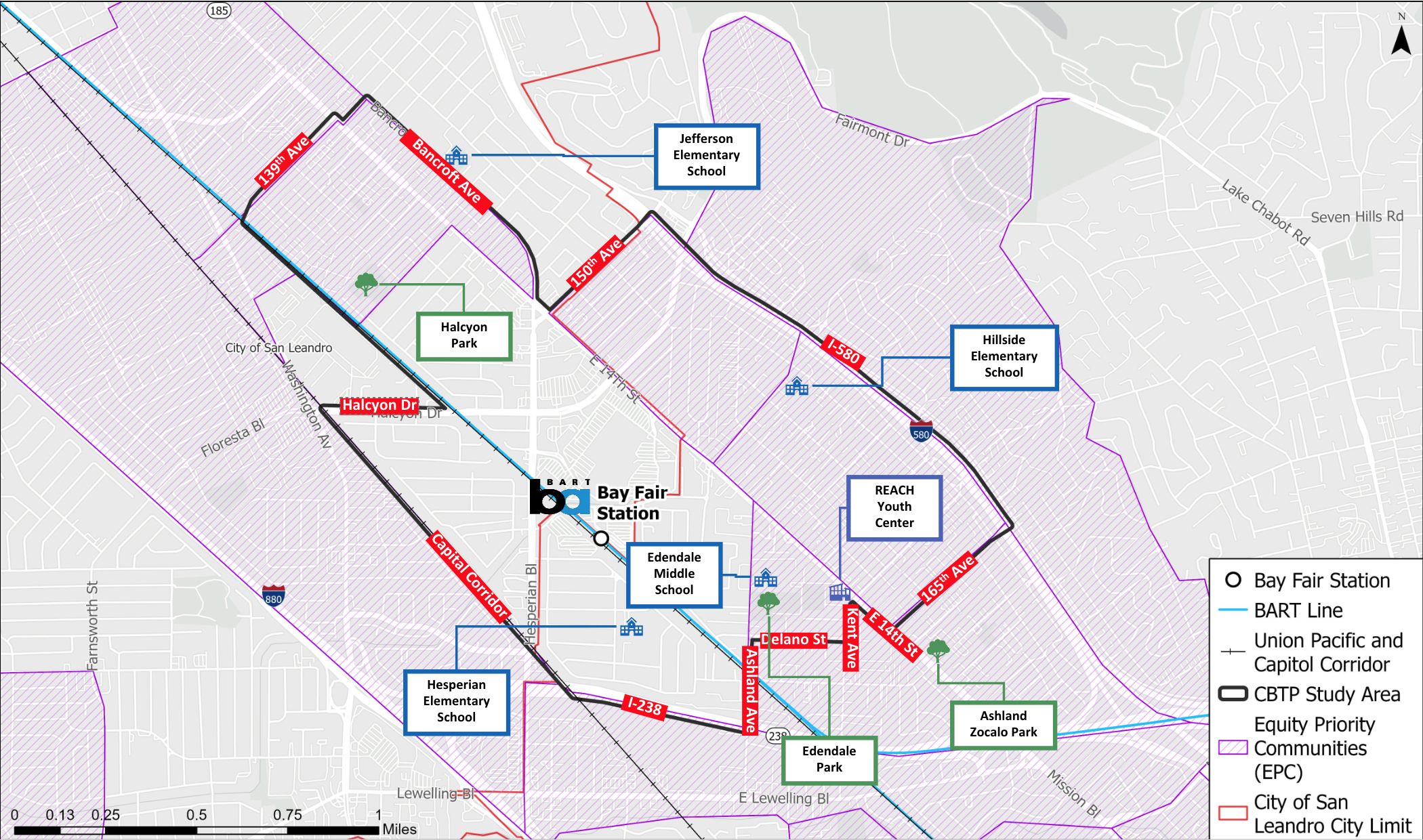 Neighborhoods around the Bay Fair BART Station, including parts of San Leandro and unincorporated Alameda County. The CBTP will focus on improvements to public streets and sidewalks—not private properties or BART-owned land.